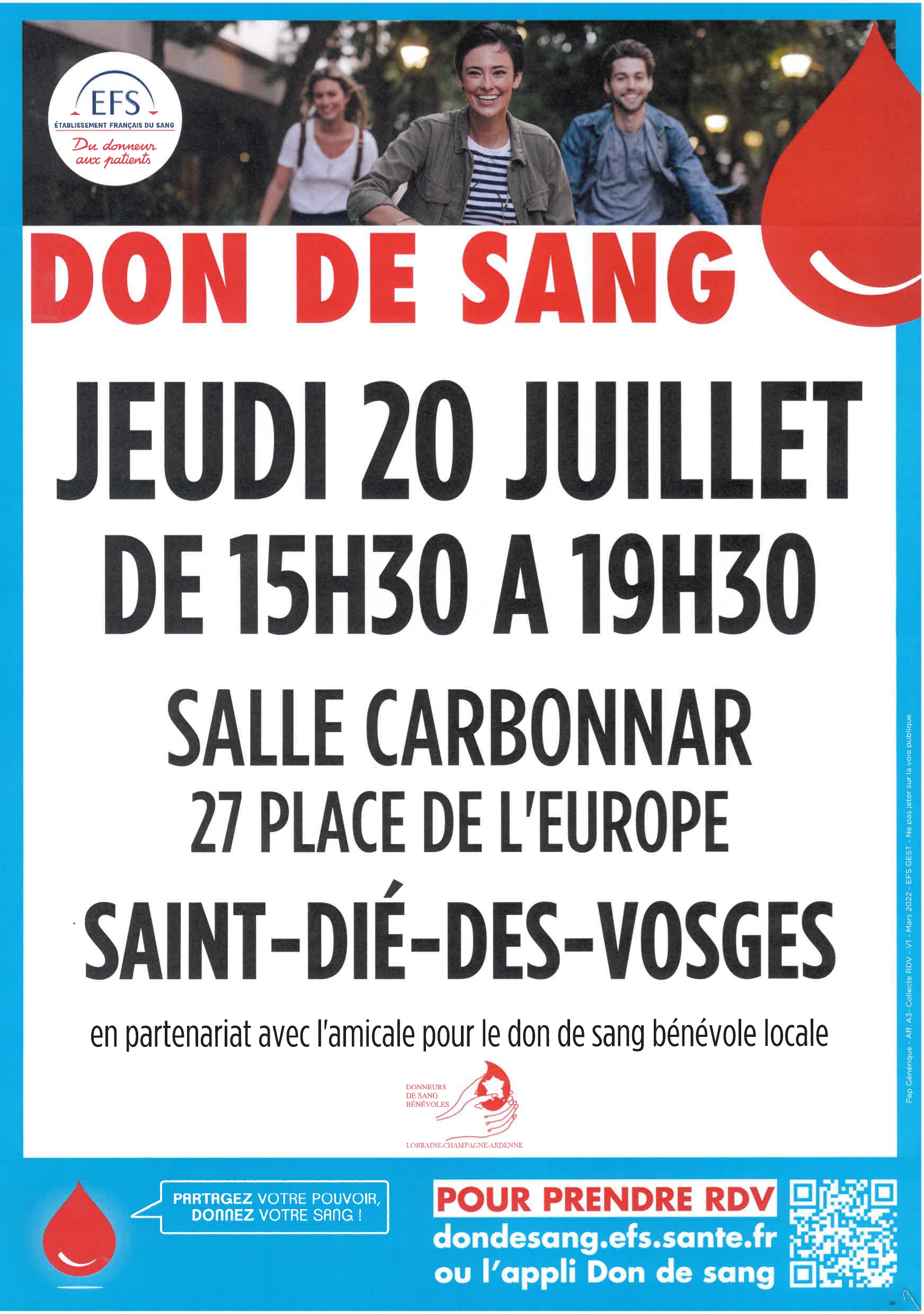 La prochaine collecte de sang mobile à Saint-Dié-des-Vosges se déroulera ce jeudi 20 Juillet à la salle Carbonnar, au 27 Place de l’Europe, de 15h30 à 19h30.
