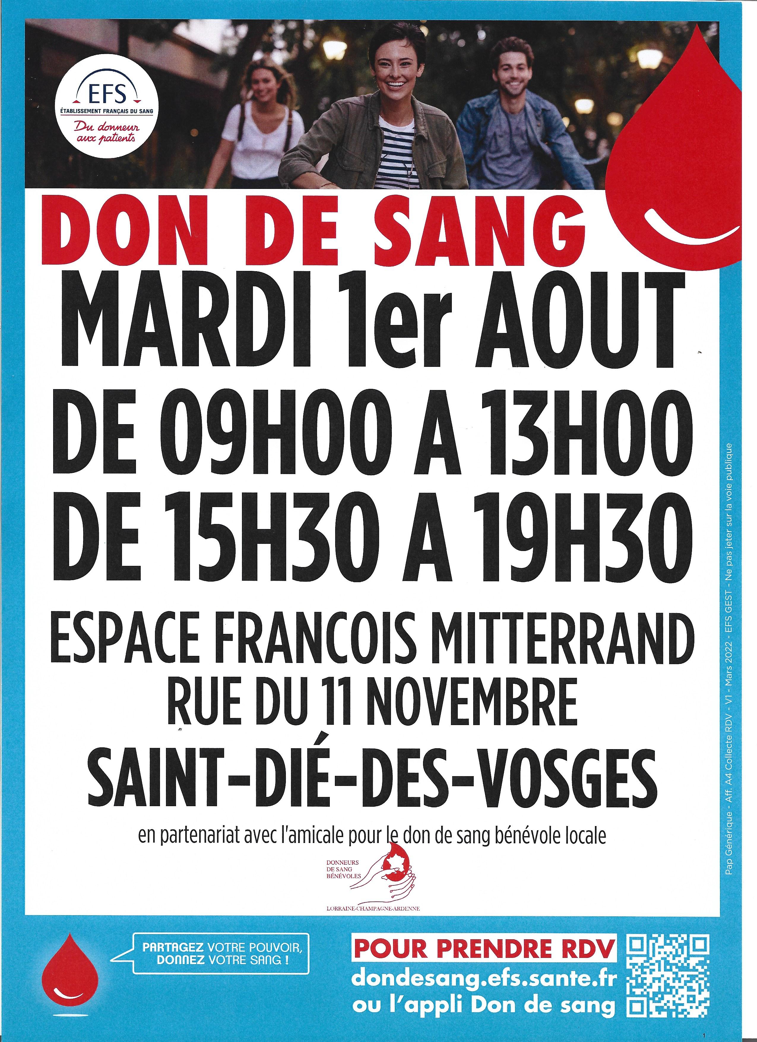 La prochaine collecte de sang mobile à Saint-Dié-des-Vosges se déroulera ce mardi 1er Août à l’Espace François-Mitterrand, de 9h00 à 13h00 puis de 15h30 à 19h30.