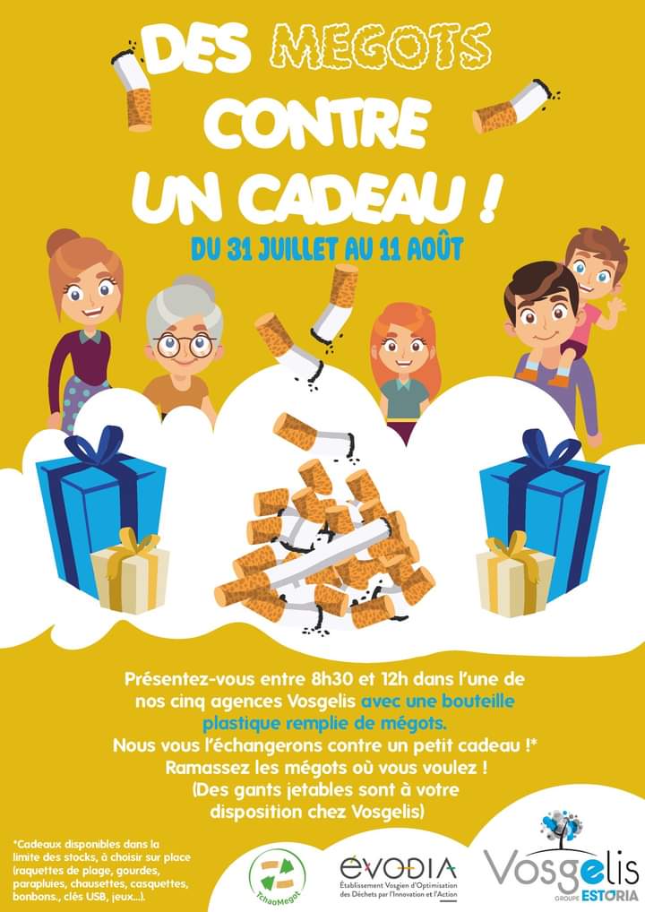 Rendez-vous jusqu’au 11 Août dans l’une des 5 agences Vogelis aux horaires d’ouverture, de 8h30 à 12h00 : en échange d’une bouteille remplie de mégot, gagnez un cadeau offert par Vosgelis et Évodia !