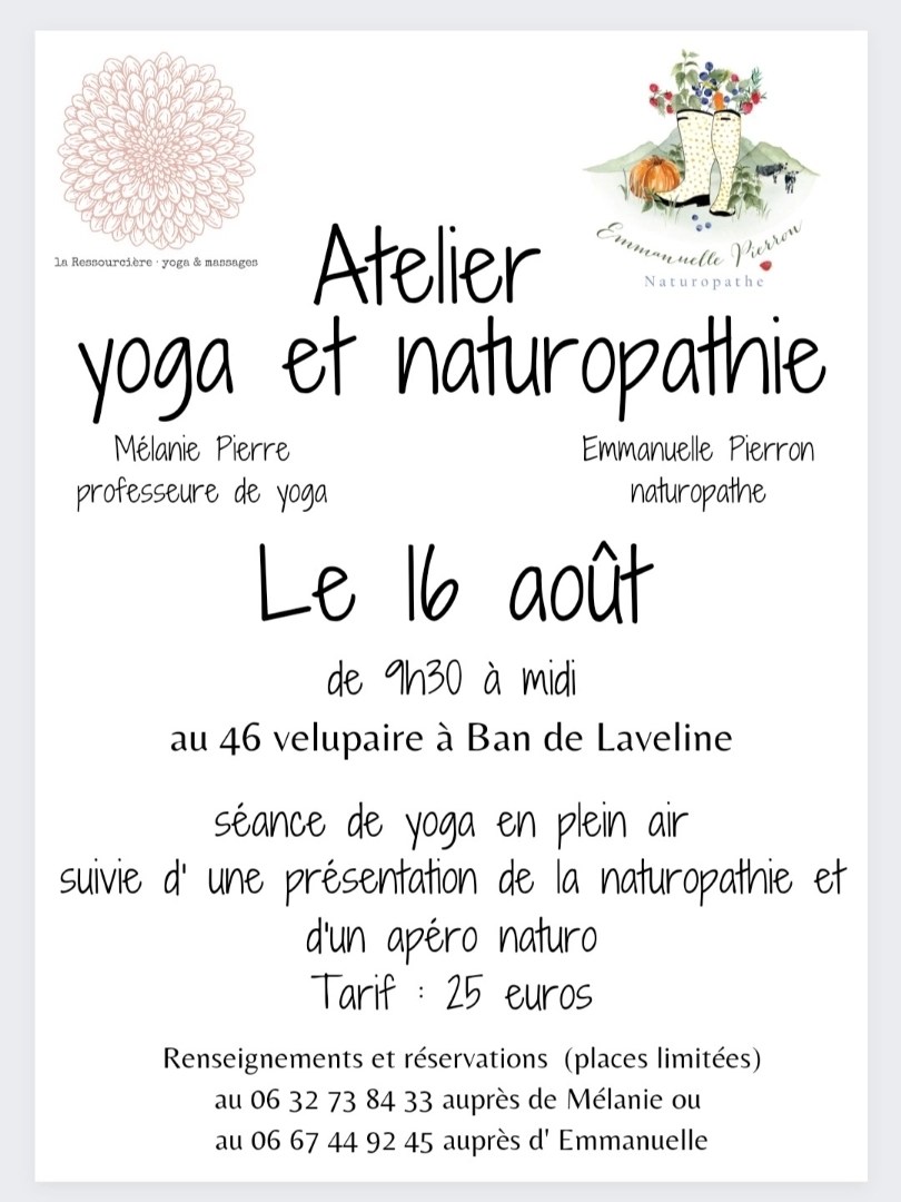 Mélanie Pierre, professeure de yoga, et Emmanuelle Pierron, naturopathe, proposent une séance de yoga et présentation de la naturopathie, suivi d’un apéritif nature, le 16 Août de 9h30 à 12h00, au 46 Velupaire, à Ban-de-Laveline.