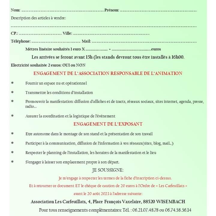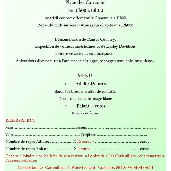 Un apéritif est offert par la commune de Wisemabch dès 11h00, suivi d’un repas sur réservation dès 12h00. Mr Carfeuillat et Plainfi proposeront aux enfants un « mini disco » dès 14h00 pour une ambiance festive au top !