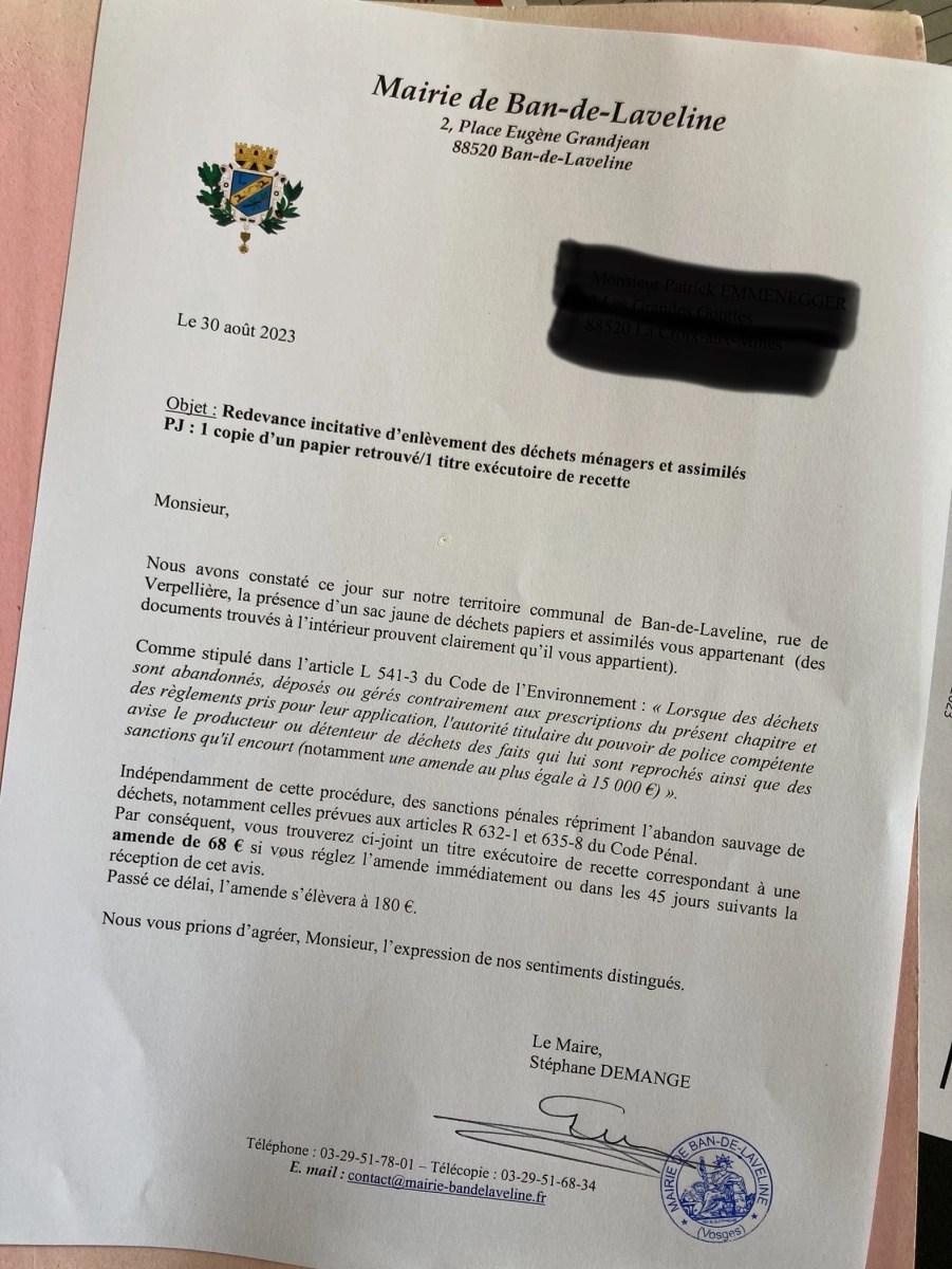 La mairie de Ban-de-Laveline a commencé depuis le 21 Août à fouiller systématiquement les sacs déposés illégalement pour identifier leur propriétaires : dès lors, les contraventions sont tombées !