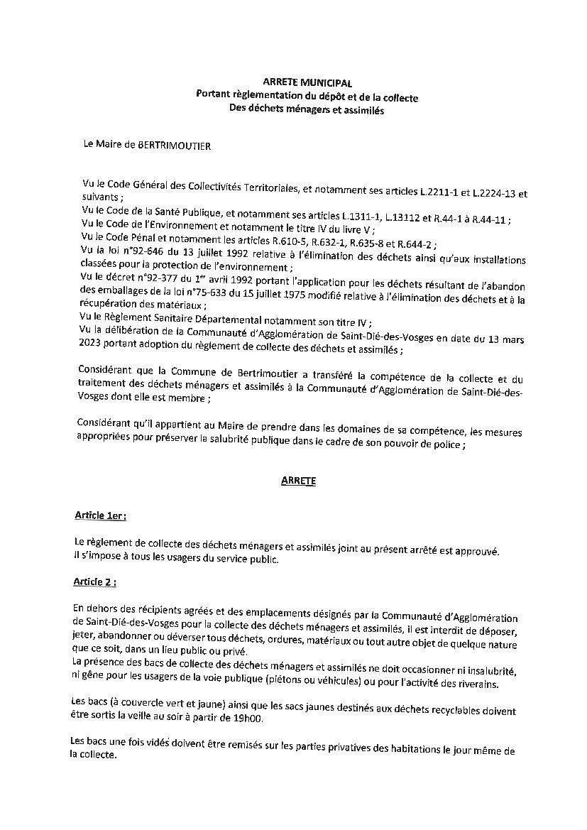 Le maire rappelle que l’arrêté municipal du 5 Avril 2023 a pour objet ce respect du bien vivre ensemble en lien avec le dépôt des déchets ménagers et la salubrité du territoire communal : toute contravention à cet arrêté fera l’objet de poursuites à l’encontre de son auteur.