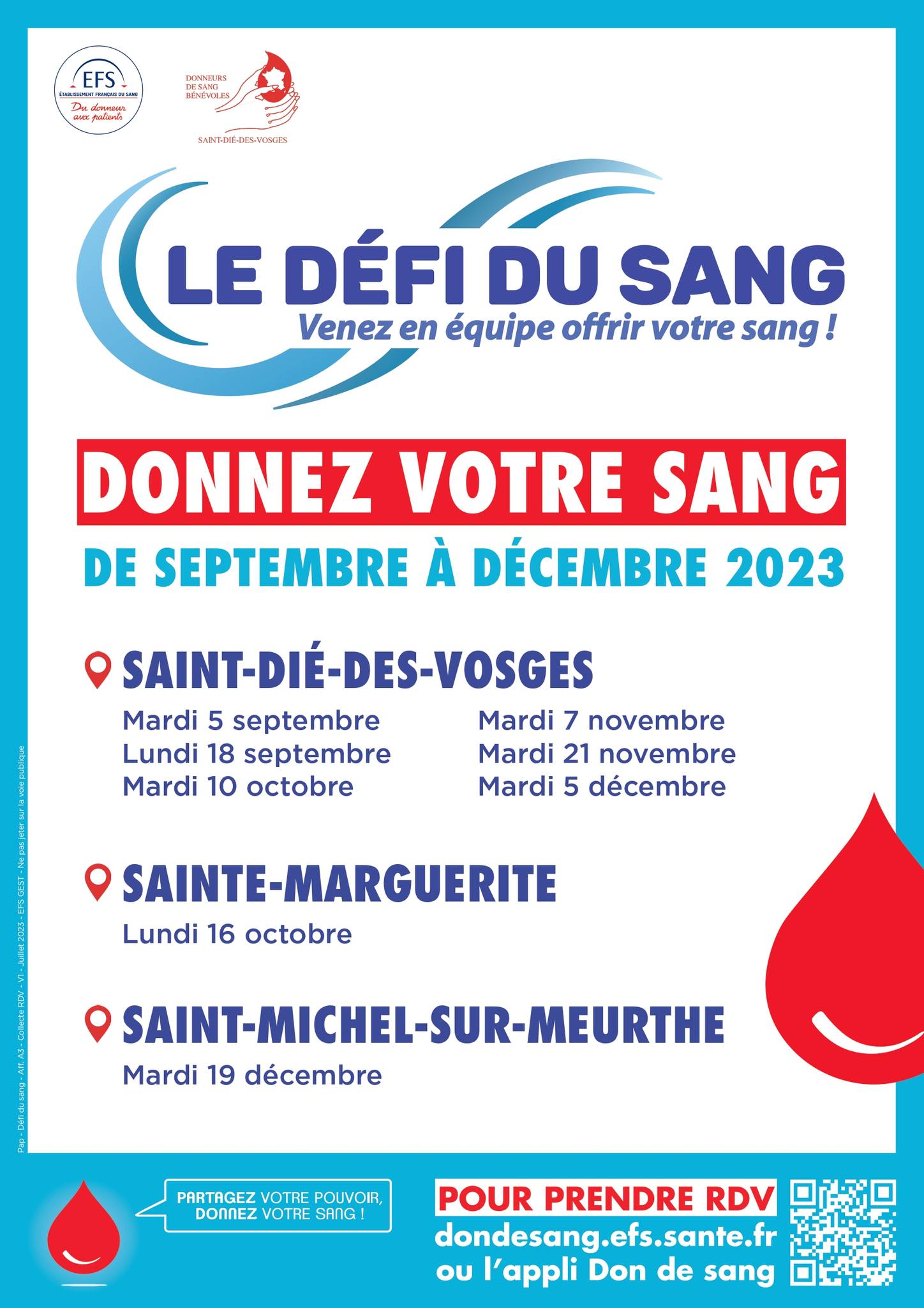 Du 5 Septembre au 19 Décembre, l’Amicale des Donneurs de Sang de Saint-Dié-des-Vosges renouvelle le Défi du Sang comme l’an dernier, en partenariat avec l’EFS Grand Est !