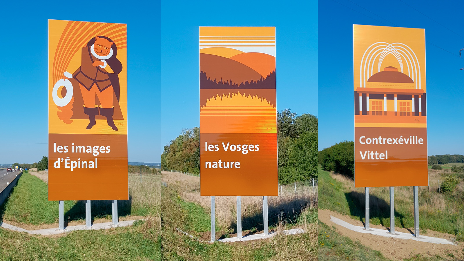 Sur l’A31, traversant le département des Vosges, 9 panneaux grands formats de signalisation d’animation culturelle et touristique sont en cours d’installation ! Le but est de rendre visible le département, son histoire, sa culture et sa géographie.