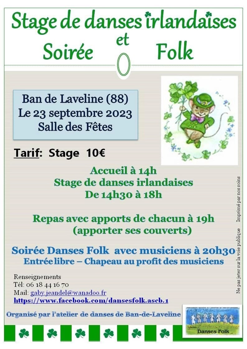 Pour rappel, demain a lieu un stage sur les danses irlandaises à la Salle des Fêtes de Ban-de-Laveline dès 14h00, suivi d’un repas avec apports de chacun dès 19h00.