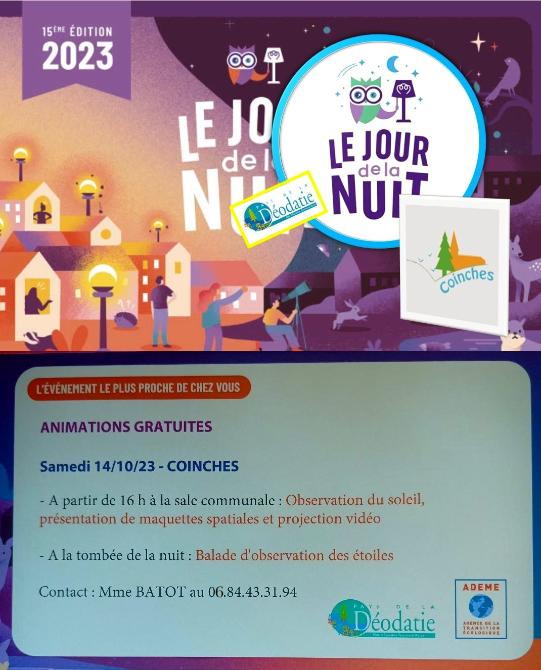 A l’occasion de la manifestation nationale du Jour de la Nuit et en partenariat avec le Pays de la Déodatie, la commune de Coinches organise un rassemblement pour admirer maquettes et étoiles le 14 Octobre 2023 dès 16h00.