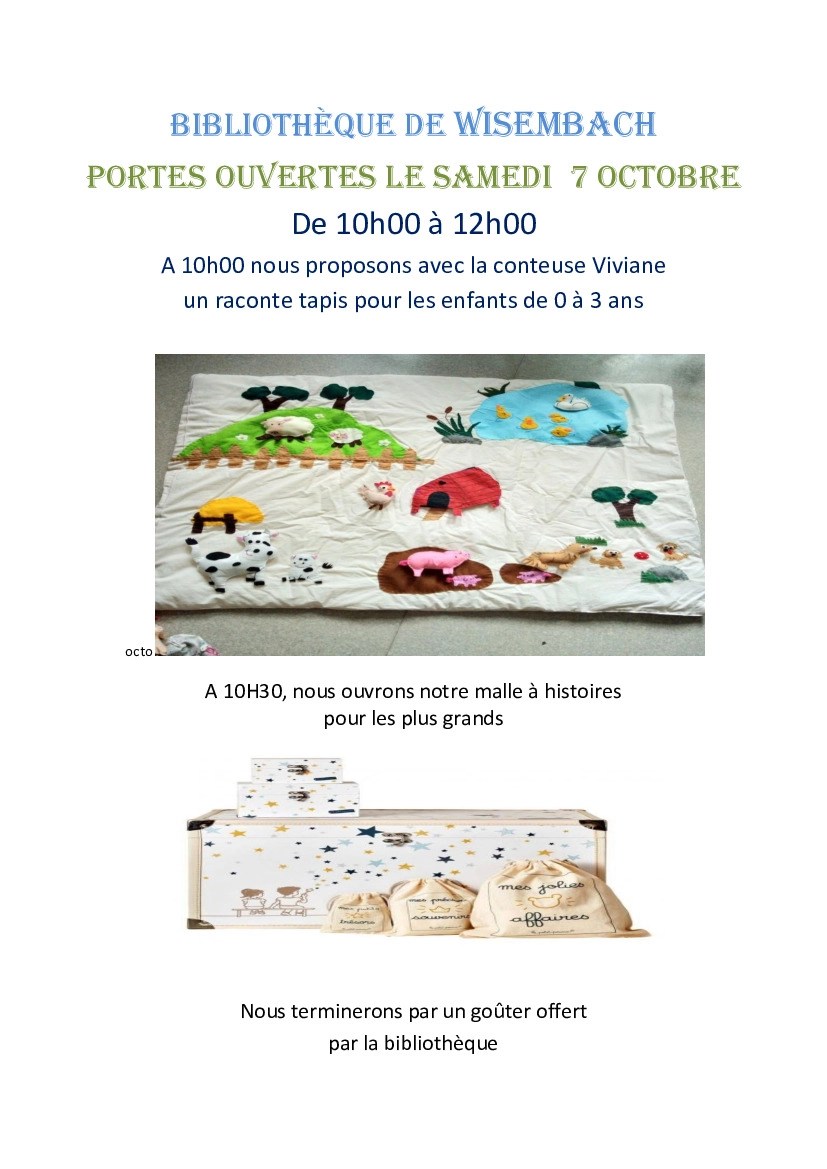 Rendez-vous demain samedi 7 Octobre pour les portes ouvertes de la Bibliothèque de Wisembach dès 10h00 ! Au programme, un raconte-tapis avec la conteuse Viviane pour les jeunes enfants.