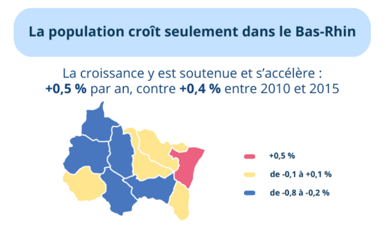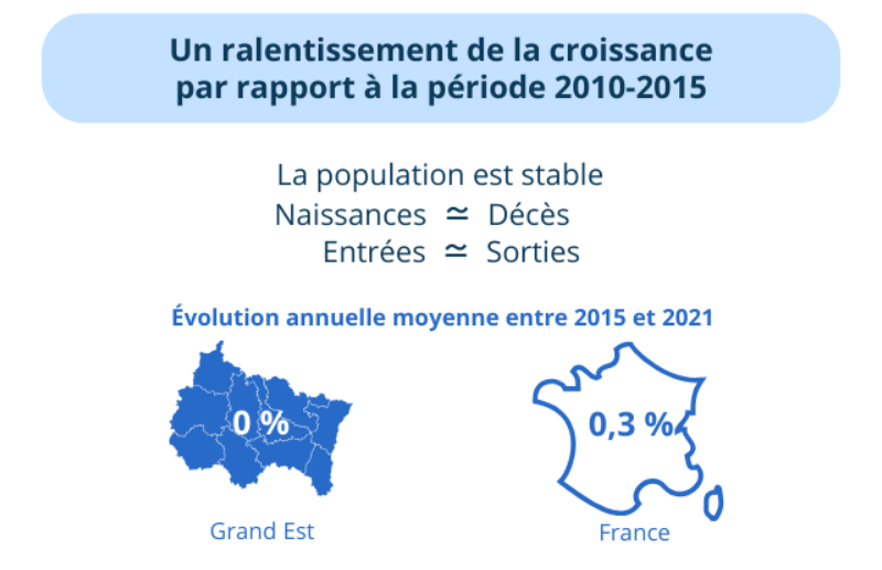 Avec une évolution moyenne de la population quasi nulle avec +2200 habitants, le Grand Est est la 6ème région la plus peuplée de France, avec un excédent naturel de 0,3% et un déficit migratoire de 0,2% par an.