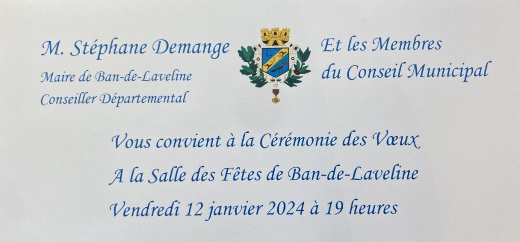 Tous les Lavelinois sont cordialement invités aux vœux du Maire ce vendredi à 19h00 à la salle des Fêtes de Ban-de-Laveline.