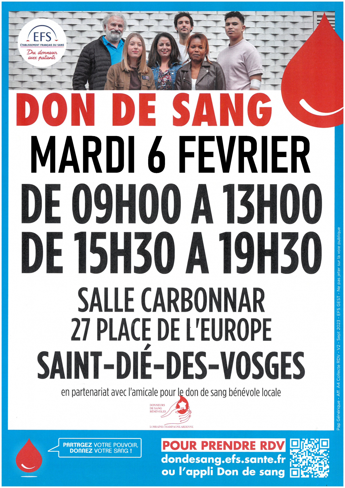 La prochaine collecte de sang à Saint-Dié-des-Vosges se déroulera mardi 4 Février 2024 à la salle Carbonnar, place de l’Europe, de 9h00 à 13h00 puis de 15h30 à 19h30.