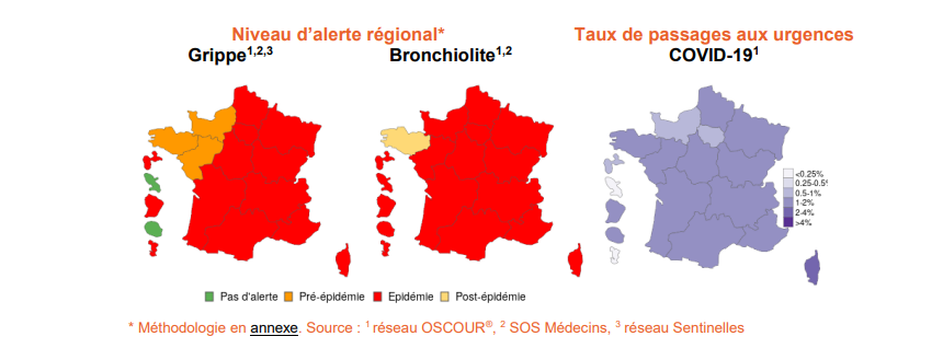 Forte fièvre, maux de tête, courbatures, l’épidémie de grippe comme la bronchiolite et le COVID-19 est très virulente cette année : l’épidémie de grippe s’est étendue à toute la France , alors que celle de bronchiolite a continué à ralentir !