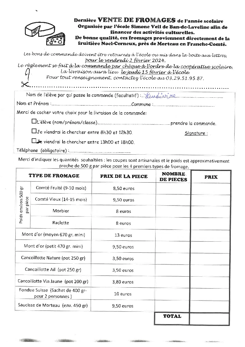 De bonne qualité, ces fromages viennent directement de la fruitière Noël-Cerneux, près de Morteau en Franche-Comté : les bons de commandes doivent être retournées à l’école ou en boîte au lettre avant le 13 Novembre 2023.