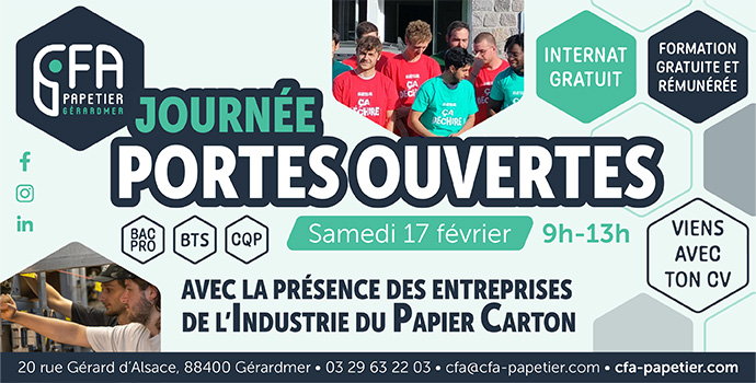 Le CFA Papetier de Gérardmer organise une journée Portes Ouvertes le samedi 17 Février 2024 pour y faire découvrir la filière innovante qu’est celle du papier !