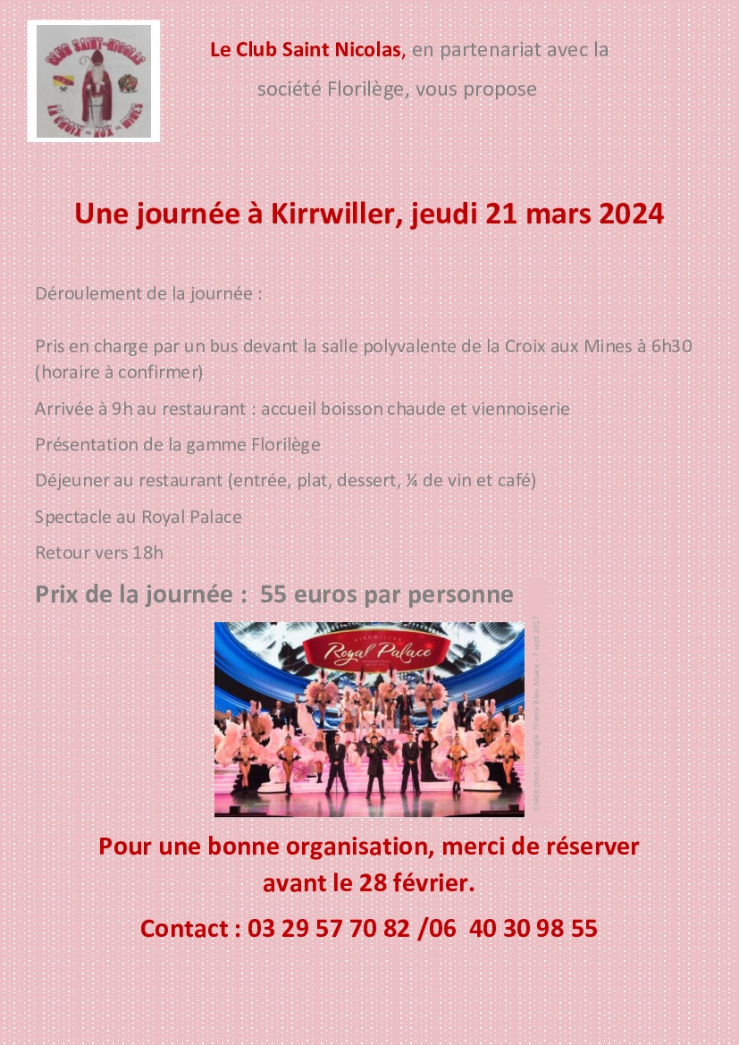 Le Club Saint-Nicolas de La Croix-aux-Mines vous propose une journée à Kirrwiller le jeudi 21 Mars 2024, en partenariat avec la société Florilège.