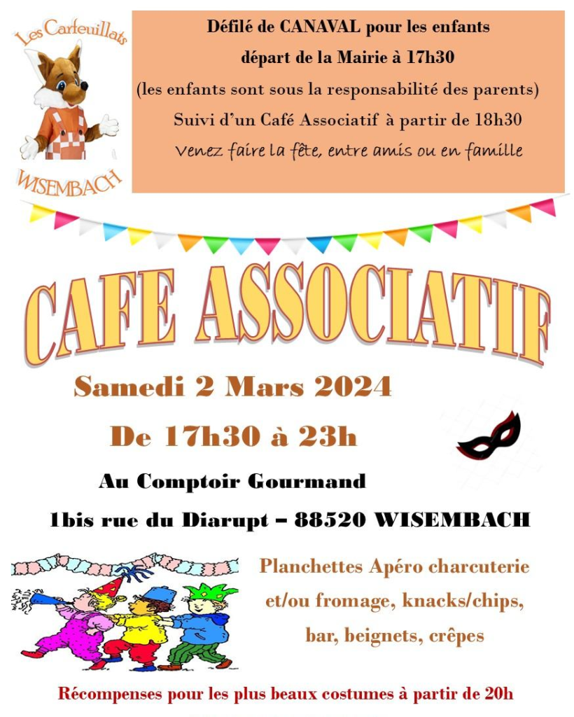 Cette festivité sera suivi d’un café associatif sur le thème du Carnaval à partir de 18h30 et jusqu’au bout de la nuit ! Election des plus beaux costumes avec plusieurs lots à gagner dès 20h00.