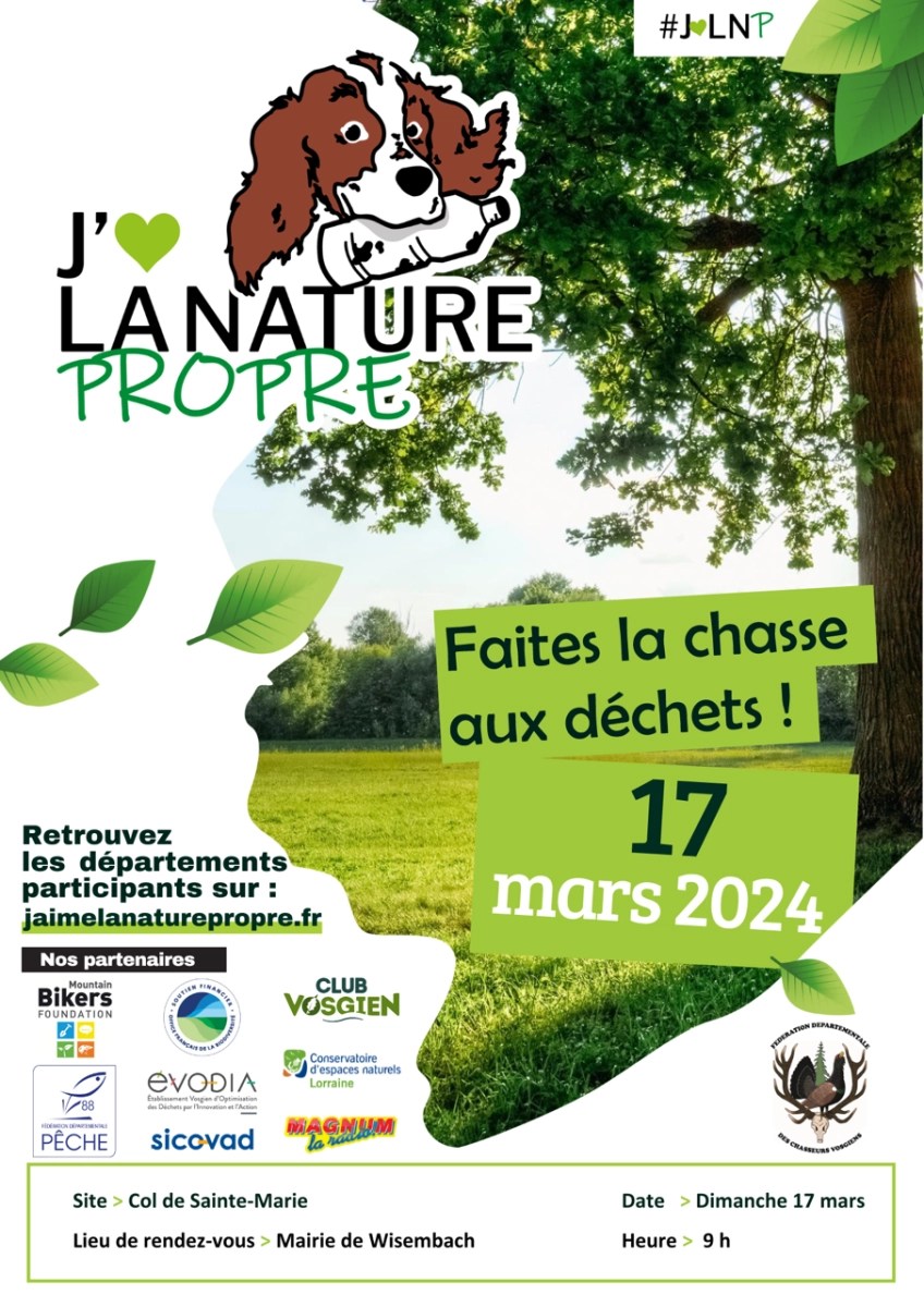Rendez-vous demain dimanche 17 Mars 2024 à 9h00 devant la mairie de Wisembach pour une opération de nettoyage J’aime la Nature Propre (JLNP) sur le col de Sainte-Marie.