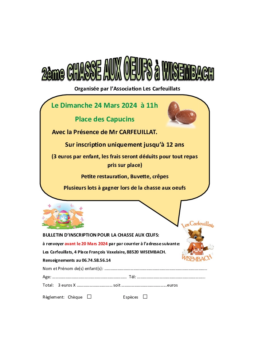 Rendez-vous sur la place des Capucins à Wisembach pour le 2ème édition de la Chasse aux Œufs de l’association Les Carfeuillats le 24 Mars 2024 à partir de 11h00 !