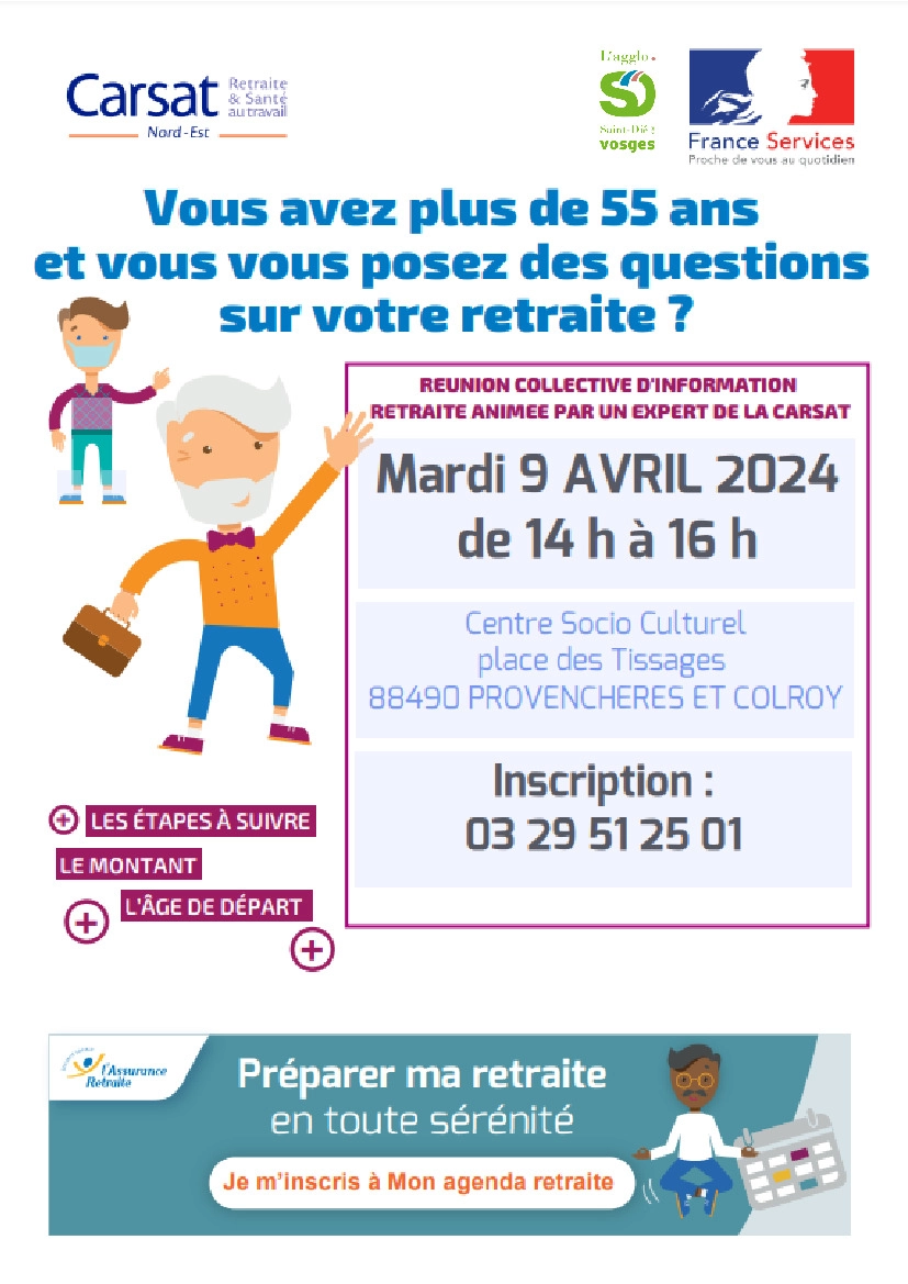 Vous avez plus de 55 ans et vous vous posez des questions sur votre retraite ? Rendez-vous demain 9 Avril 2024 pour une réunion d’information sur votre retraite à Provenchères-et-Colroy !
