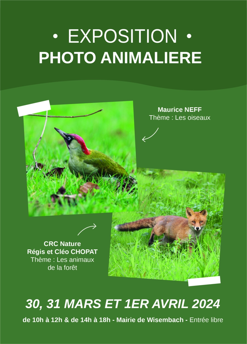 Lors du week-end de Pâques, la mairie de Wisembach fut le cœur d’une exposition-photo sur les thèmes des oiseaux et animaux de la forêt, proposé par les photographes amateurs Maurice Neff, côté oiseau, Régis et Cléo Chopat, côté forêt.