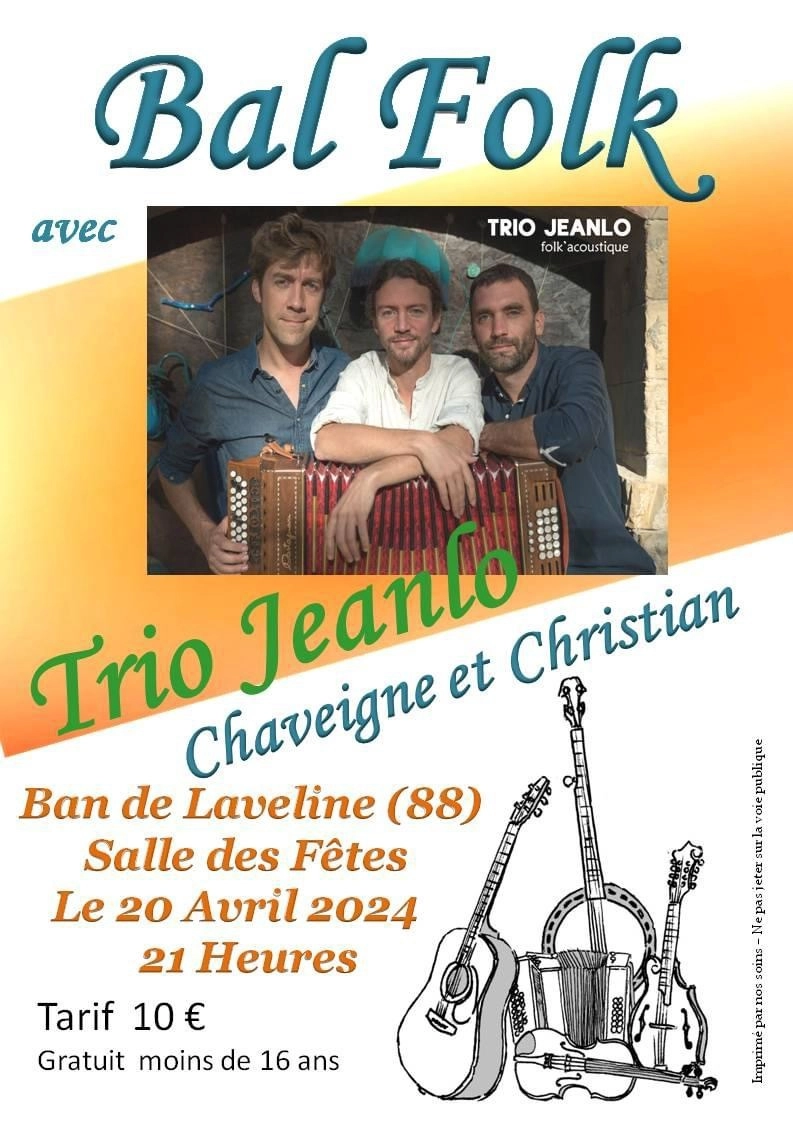 Rendez-vous le samedi 20 Avril 2024 pour un bal folk organisé par l’ASCB Danses Folk à la Salle des Fêtes de Ban-de-Laveline avec le Trio Jeanlo dès 21h00 ! Un bal sous un air folk acoustique, pour amateurs comme experts !