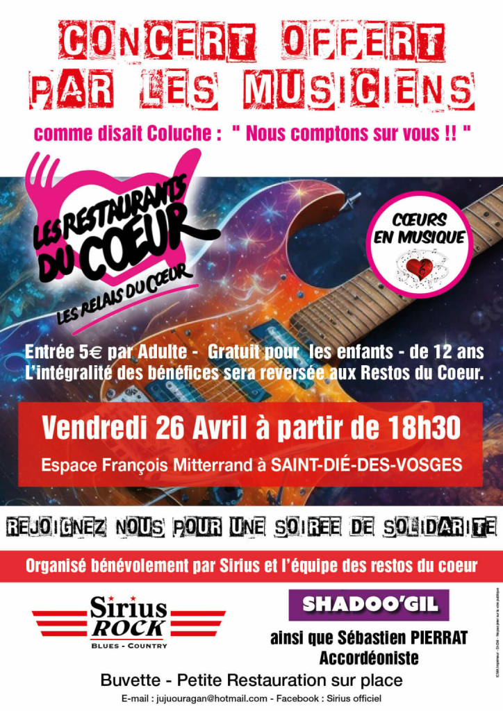 Sur scène se succéderont les groupes Sirius Rock et Shadoo’Gil, avec la présence de l’accordéoniste Sébastien Pierrat. L’entrée est à 5€ pour les adultes, gratuite pour les enfants de -12 ans : l’intégralité des bénéfices du concert sera ensuite reversé aux Restos du Cœur de Saint-Dié-des-Vosges.