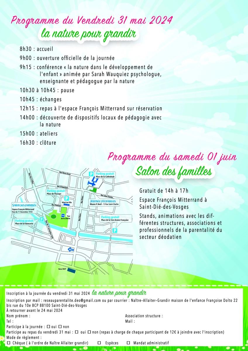 Le réseau parentalité déodatien et l’association Naître Allaiter Grandir vous invitent à la journée d’échanges sur la parentalité et le Salon des Familles avec comme thème La Nature pour grandir ! A quelles dates ?