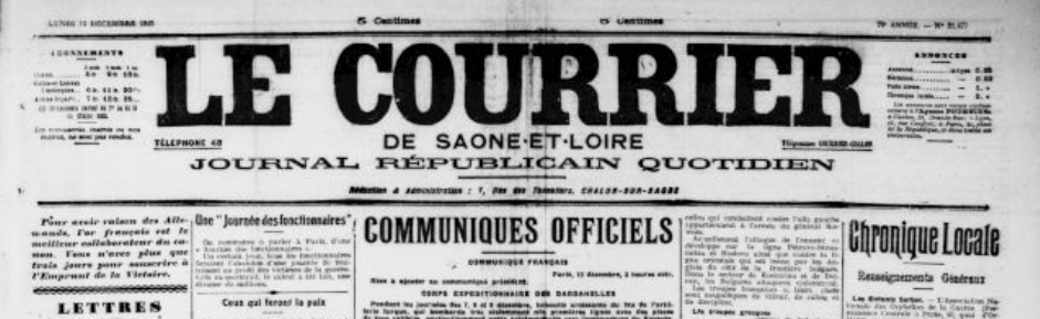 Dans ce numéro, découvrez un article du journal Courrier de Saône-et-Loire du 13 Décembre 1915 sur un mort pour la Patrie à Ban-de-Laveline !