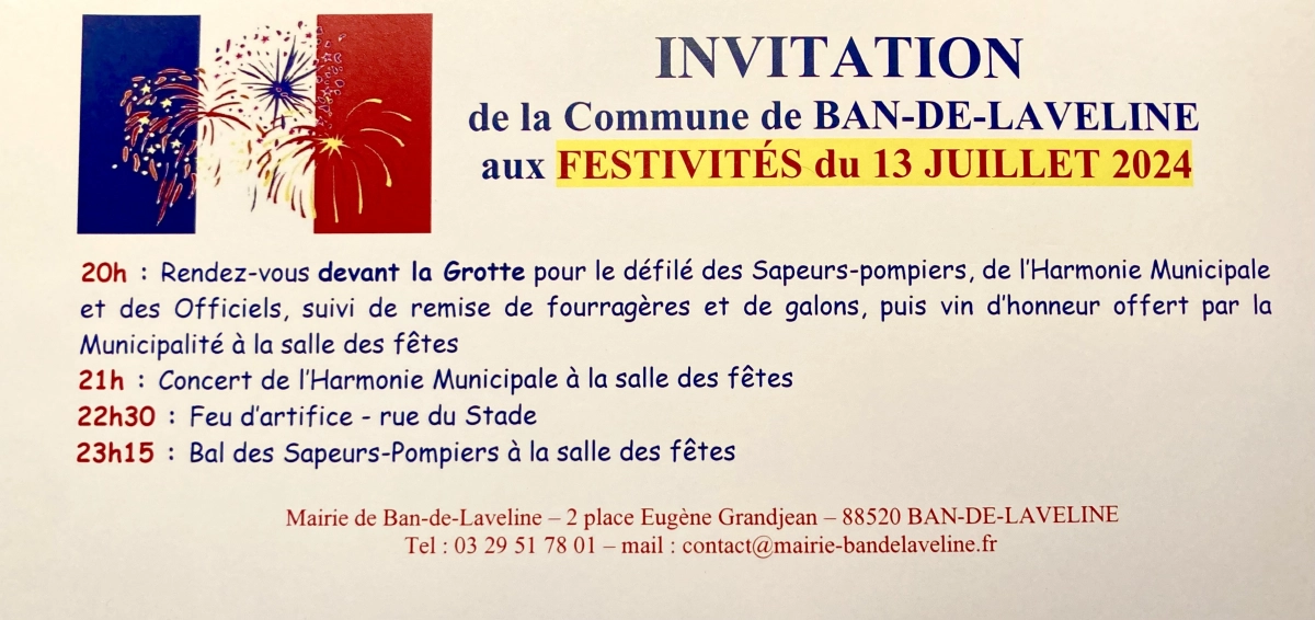 La municipalité de Ban-de-Laveline invite via sa station Illiwap tout·e·s les Lavelinois·e·s, à l’occasion de la Fête Nationale, le samedi 13 Juillet.