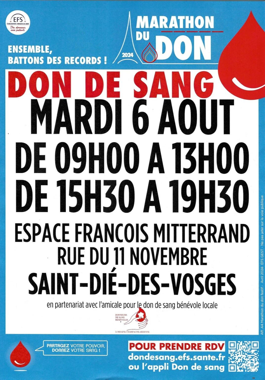 La prochaine collecte de sang à Saint-Dié-des-Vosges se déroulera demain mardi 6 Août à l’espace François-Mitterrand, de 9h00 à 13h00 et de 15h30 à 19h30.