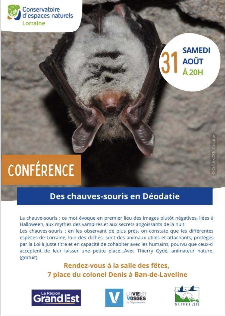 Rendez-vous demain samedi 31 Août dès 20h00 pour une conférence sur la chauve-souris en Déodatie à la salle des Fêtes de Ban-de-Laveline.