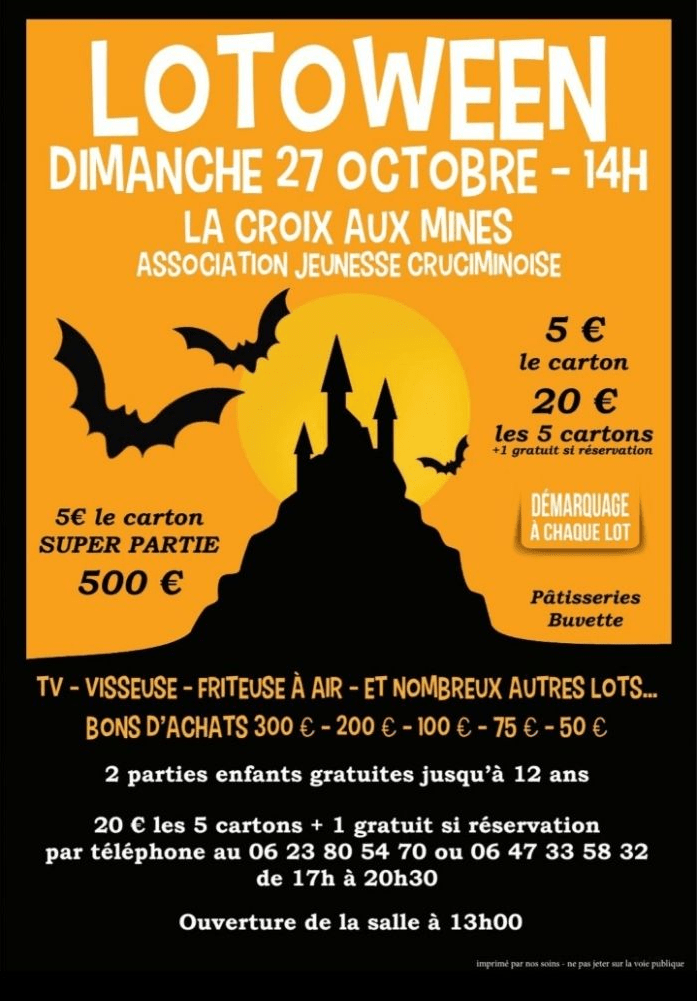 L’association Jeunesse Cruciminoise organise son Lotoween le dimanche 27 Octobre 2024 à la salle polyvalente de La Croix-aux-Mines !