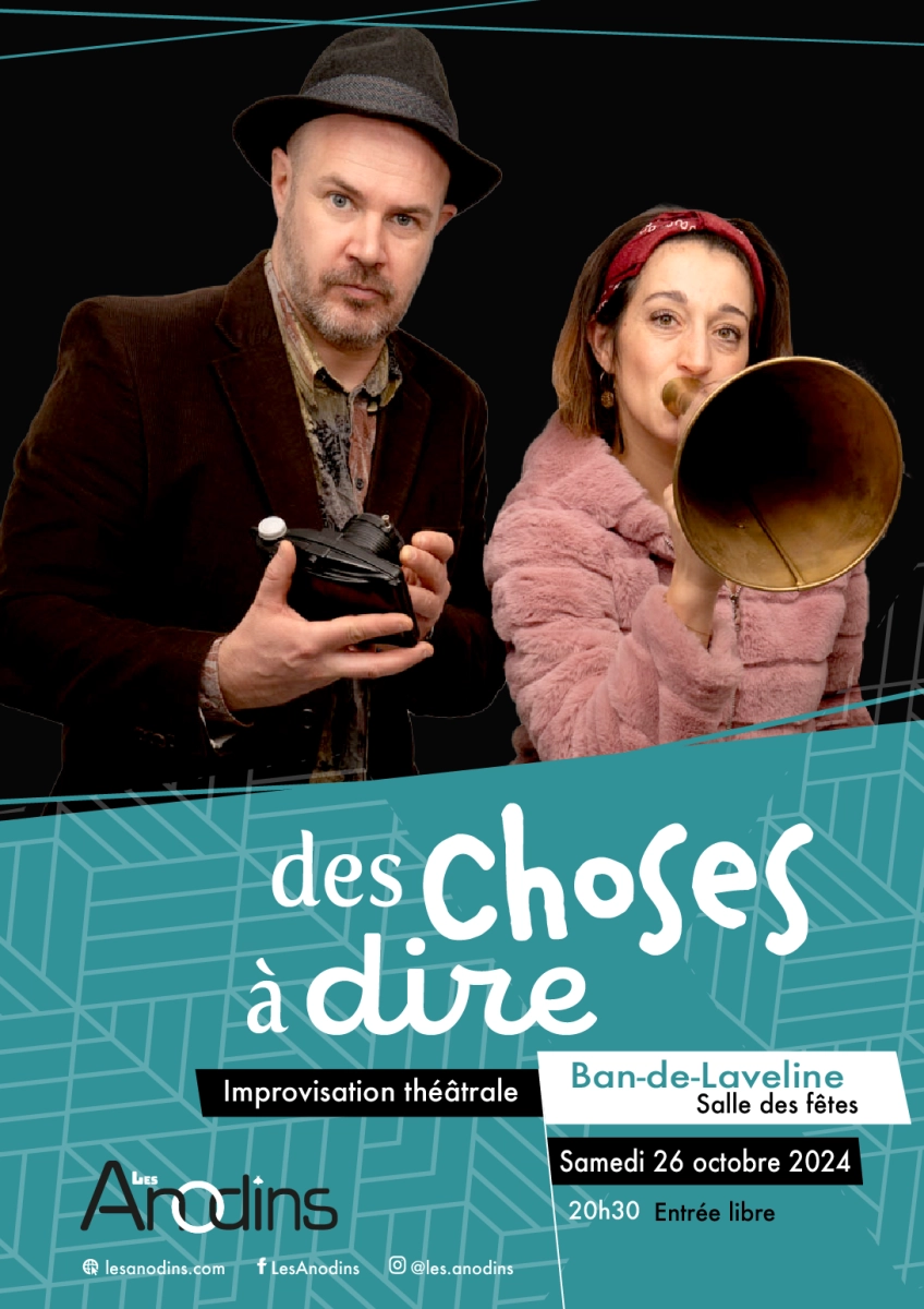 Comme chaque année, les Anodins reviennent à Ban-de-Laveline pour vous proposer leur spectacle de théâtre d’improvisation ! Rendez-vous le samedi 26 Octobre 2024 à 20h30 à la salle des Fêtes dans le cadre du festival « Laveline en scène » !