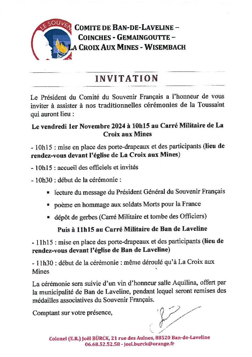 Le comité du Souvenir Français de Ban-de-Laveline – Coinches – La-Croix-aux-Mines – Wisembach vous convie aux traditionnelles cérémonies de la Toussaint en cette année 2024 ! Rendez-vous le vendredi 1er Novembre 2024 à 10h15 au Carré Militaire de La-Croix-aux-Mines.