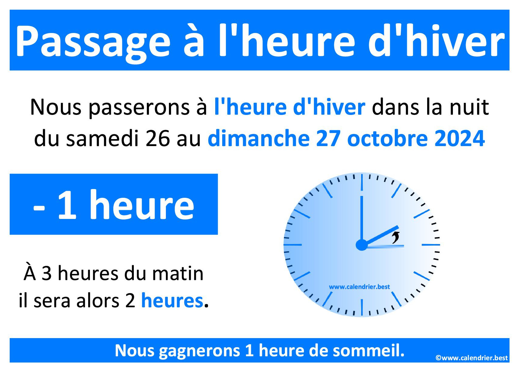 Le passage à l’heure d’hiver se fera dans la nuit du samedi 26 au dimanche 27 Octobre 2024 : on recule d’une heure, ainsi à 3h00 du matin, il sera donc 2h00 ! Cette heure nocturne supplémentaire fera le bonheur des « gros dormeurs » !