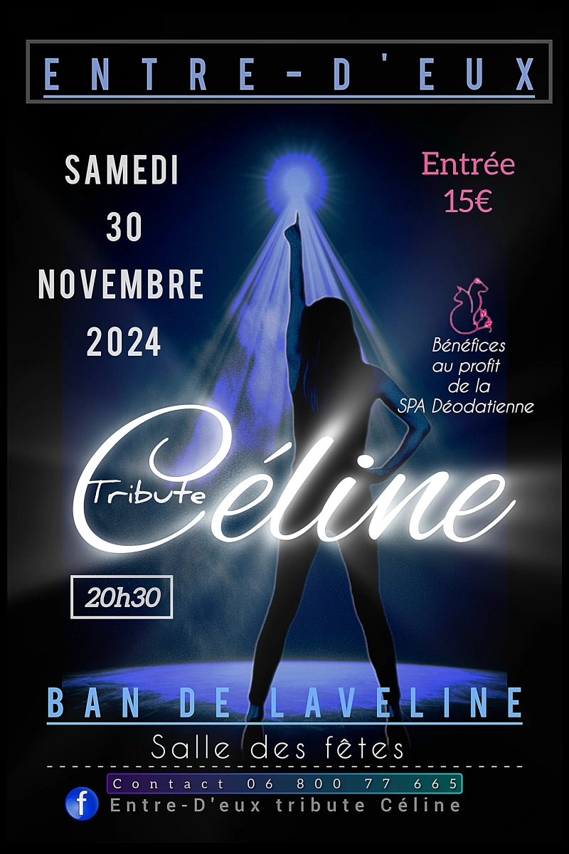 Rendez-vous le 30 Novembre 2024 dès 20h30 à la salle des fêtes de Ban-de-Laveline pour un concert de reprises de Céline Dion avec le groupe ENTRE-D’EUX Tribute Céline Dion, cinq musiciens passionnées du Grand Est !