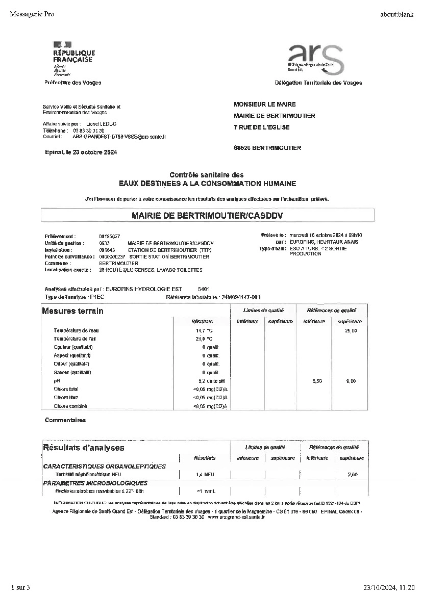 L’Agence Régionale de Santé a analysé l’eau potable du réseau de Bertrimoutier en ce mois d’Octobre. Vous trouverez ci-joint le dernier bulletin d’analyse de l’eau potable réalisé par l’ARS.