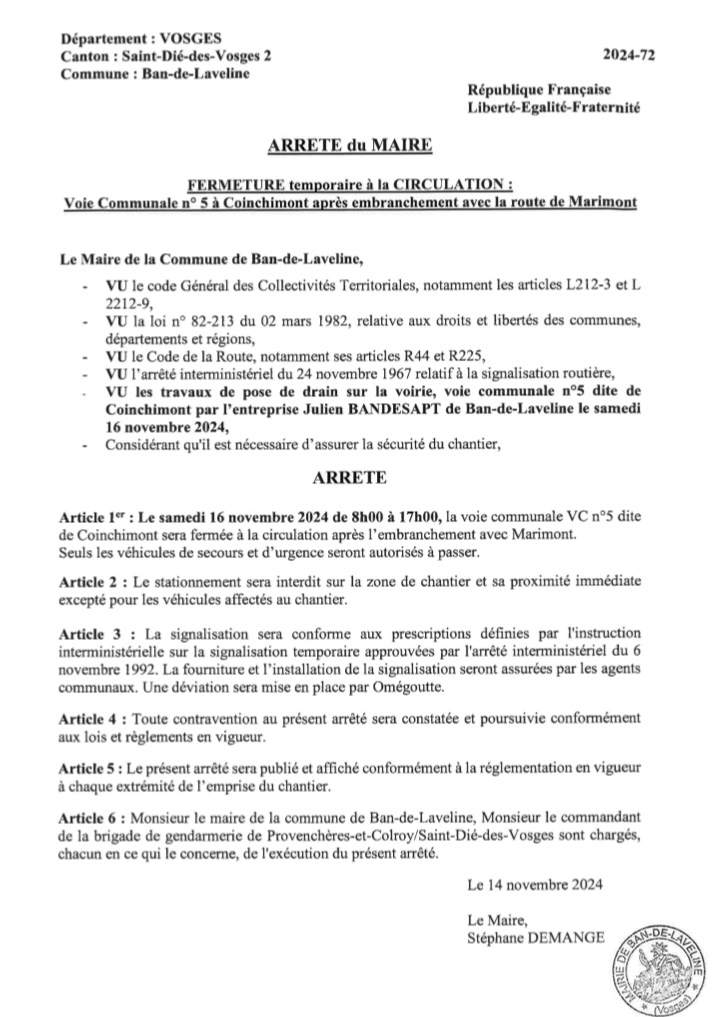 La route reliant Marimont à Coinchimont sera partiellement fermée à la circulation ce samedi 16 Novembre 2024 toute la journée.
