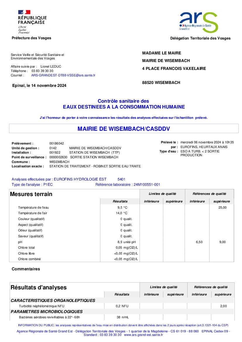 Comme chaque mois, l’Agence Régionale de Santé analyse l’eau potable du réseau de Wisembach. Vous trouverez ci-joint la dernière synthèse en date.