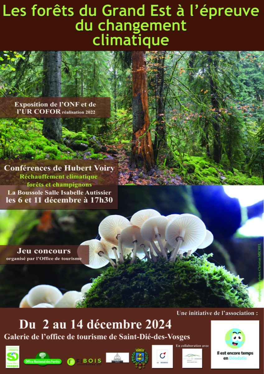 A l’initiative de l’association Il est encore temps en Déodatie, une exposition sur les forêts du Grand Est à l’épreuve du changement climatique aura lieu dès demain 2 Décembre, et jusqu’au 14 Décembre 2024 dans la galerie de l’Office de Tourisme de Saint-Dié-des-Vosges.