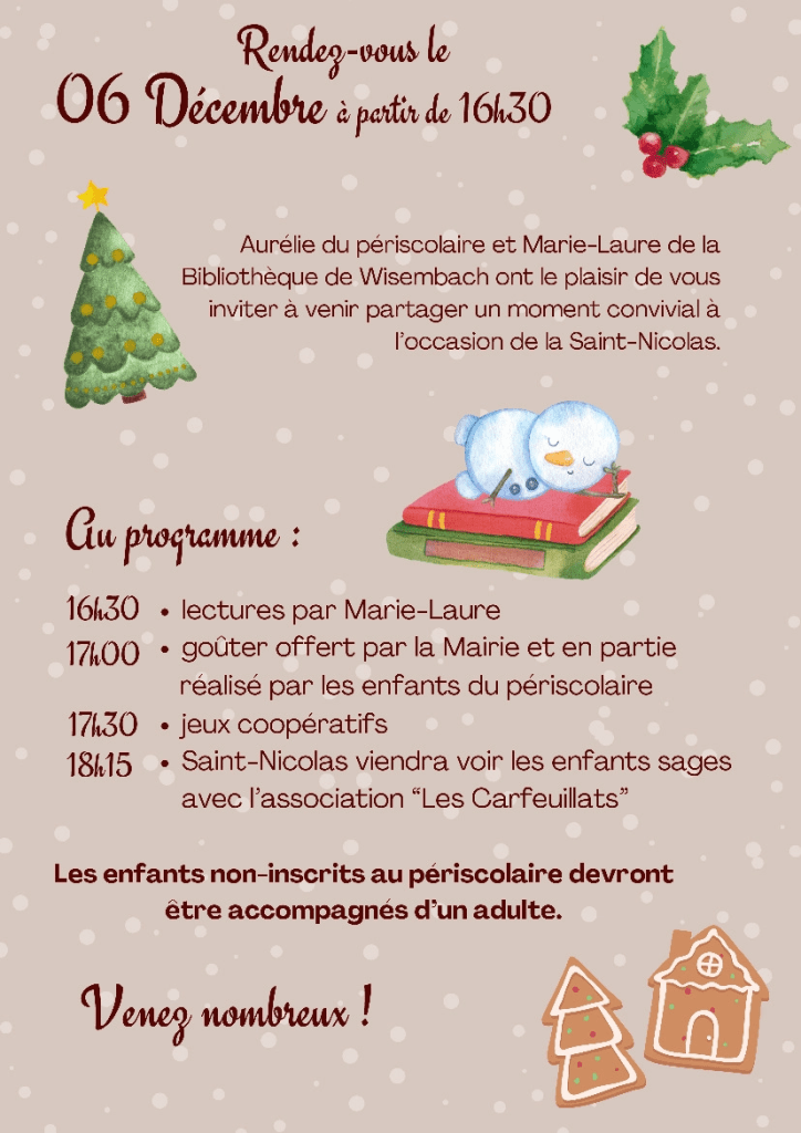 Rendez-vous ce vendredi 6 Décembre pour un moment de partage à l’heure de la Saint-Nicolas à partir de 16h30 à la Bibliothèque de Wisembach.