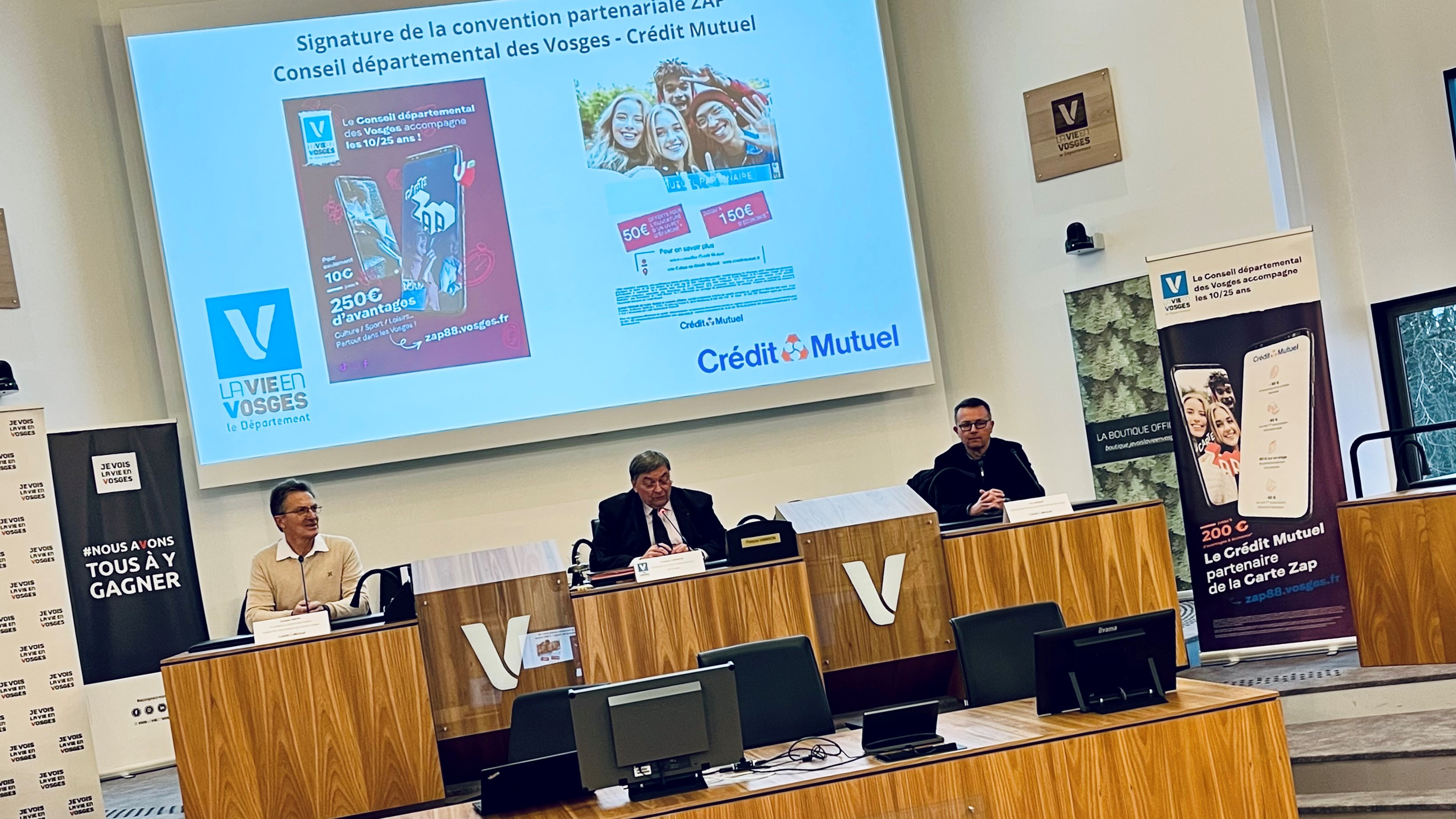 Cette convention vise à renforcer les avantages offerts aux jeunes vosgiens. Le Crédit Mutuel, un partenaire historique, propose des offres intéressantes aux jeunes titulaires de la carte ZAP : 50 € pour l’ouverture d’un premier compte, 50 € pour une première assurance multi risques habitation, 50 € pour une première assurance voiture, et 50 € pour un stage de perfectionnement à la conduite.