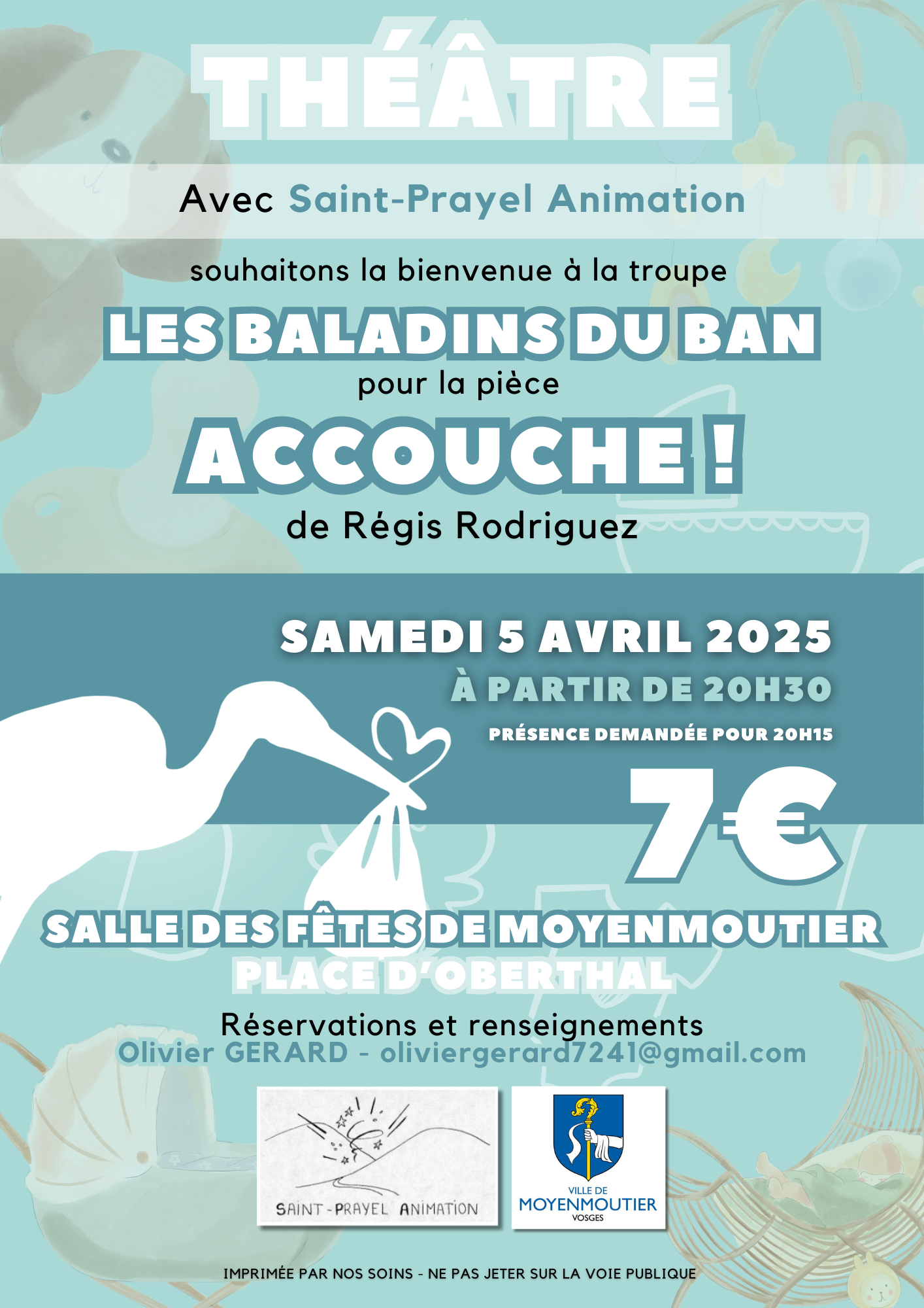 Amatrices et amateurs de théâtre, les Baladins du Ban continue leur saison théâtrale 2025 à l’extérieur ce samedi 5 Avril à Moyenmoutier ! Prêt.es pour (re)découvrir les joies de la grossesse ?