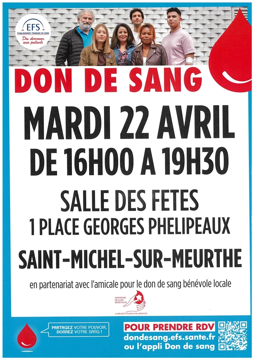 La prochaine collecte de sang à Saint-Michel-sur-Meurthe se déroulera demain mardi 22 Avril 2025 à la salle des Fêtes, de 16h00 à 19h30.