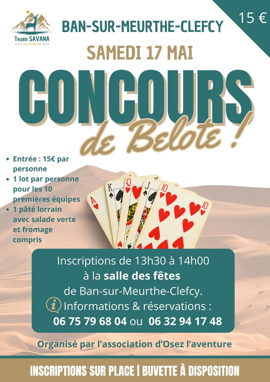 Rendez-vous le samedi 17 Mai 2025 à la salle des Fêtes de Ban-sur-Meurthe-Clefcy pour un concours de belote, organisé par l’association Osez l’aventure !
