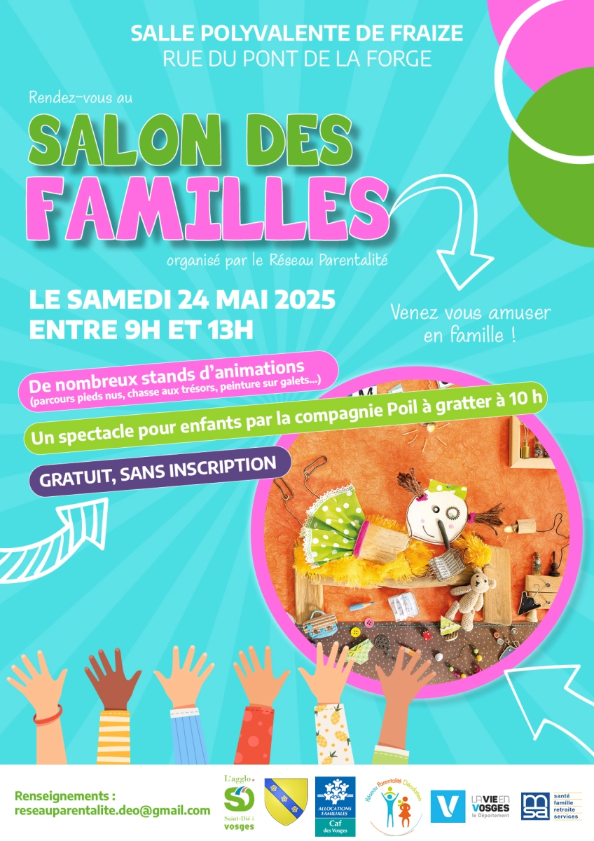 Rendez-vous au Salon des Familles, organisé par le Réseau Parentalité, le samedi 24 Mai 2025 de 9h00 à 13h00 à la salle polyvalente de Fraize, rue du Pont de La Forge.
