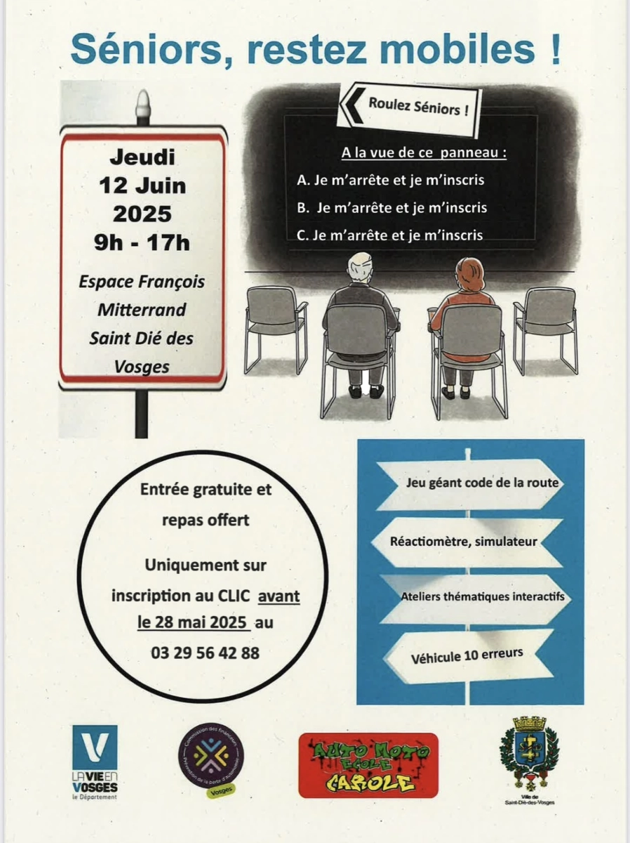 Le jeudi 12 Juin 2025, nos seniors sont invités à participer à une journée conviviale autour du thème de la mobilité, à l’Espace François Mitterrand à Saint-Dié-des-Vosges, de 9h00 à 17h00.