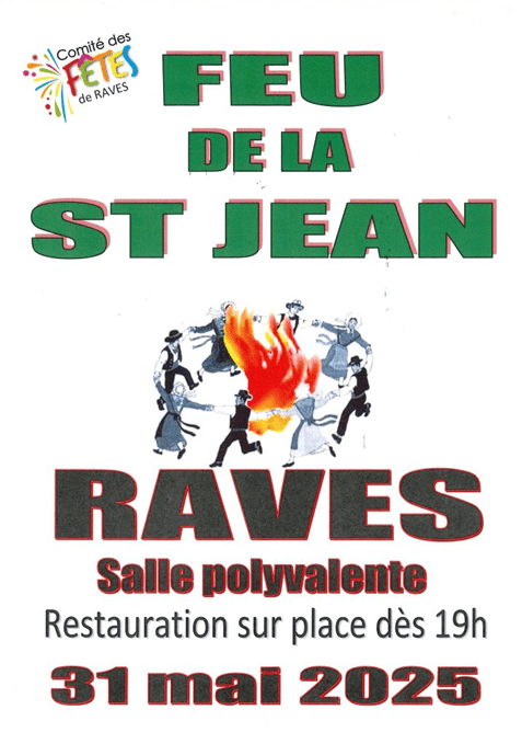 Le Comité des Fêtes de Raves organise son traditionnel Feu de la Saint-Jean le samedi 31 Mai, au niveau de la salle polyvalente de Raves.
