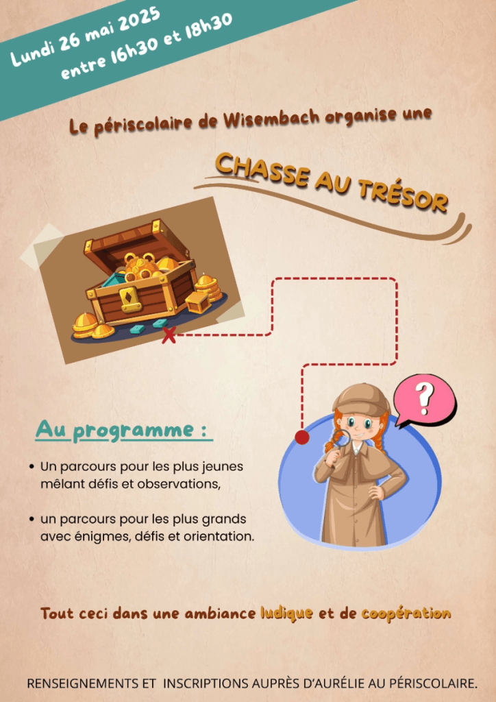 Le lundi 26 Mai 2025, entre 16h30 et 18h30, le périscolaire de Wisembach propose aux enfants une animation pleine de mystère et de bonne humeur : une grande chasse au trésor accessible à tous les âges !