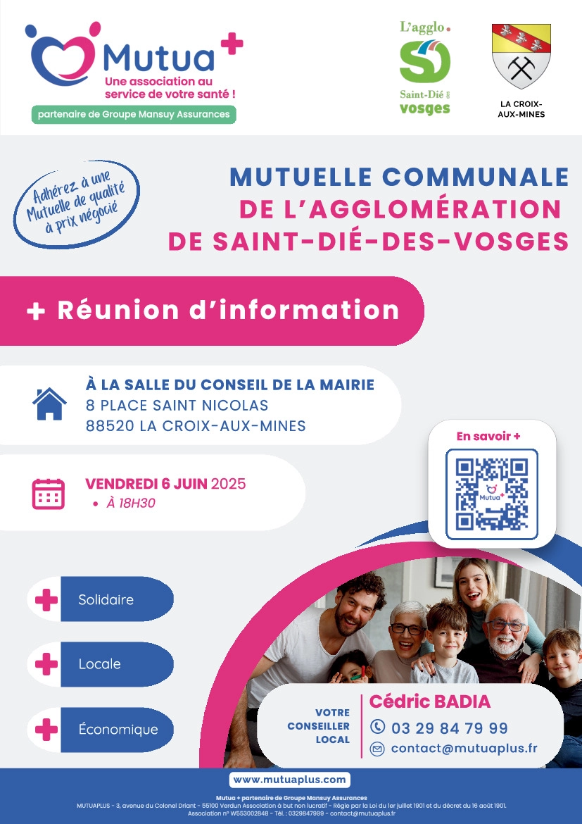 Rendez-vous ce vendredi 6 Juin 2025 pour une réunion d’information Mutua+ autour de la mutuelle communale de l’agglomération de Saint-Dié dès 18h30 à la mairie de La Croix-aux-Mines.